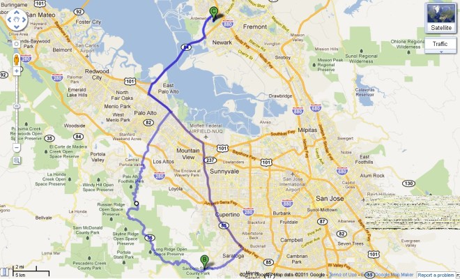 I took the freeway on my way there. Dumbarton Bridge – 101 – 85. The ride was mostly uneventful, except for a mildly odd feeling on Highway 85. This freeway has a grooved concrete pavement (for wet traction) but this seems to cause the motorcycle to drift. I loosened my grip on the handle bars and this definitely helped.