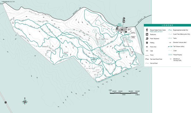 After we got comfortable on the oval, we rode down trail-1. Trail-1 is certainly not as benign as it sounds. A short distance from the entrance the trail goes into a steep descent and I was literally panicking the first time I rode it. I shifted down to first and used the engine to slow me down, but it was still a little scary. The trail is then fairly bumpy for the most part, with lots of places to jump. I rode it out pretty much standing all the way.