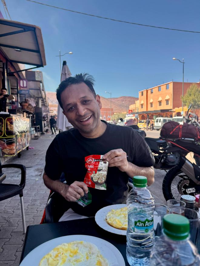 We descended down the pass into the town of Agouim where we had lunch. Lunch was very basic: a few pieces of chicken and an omelette. Shobhit had got some chaat masala with him and he would season his food during most meals.
