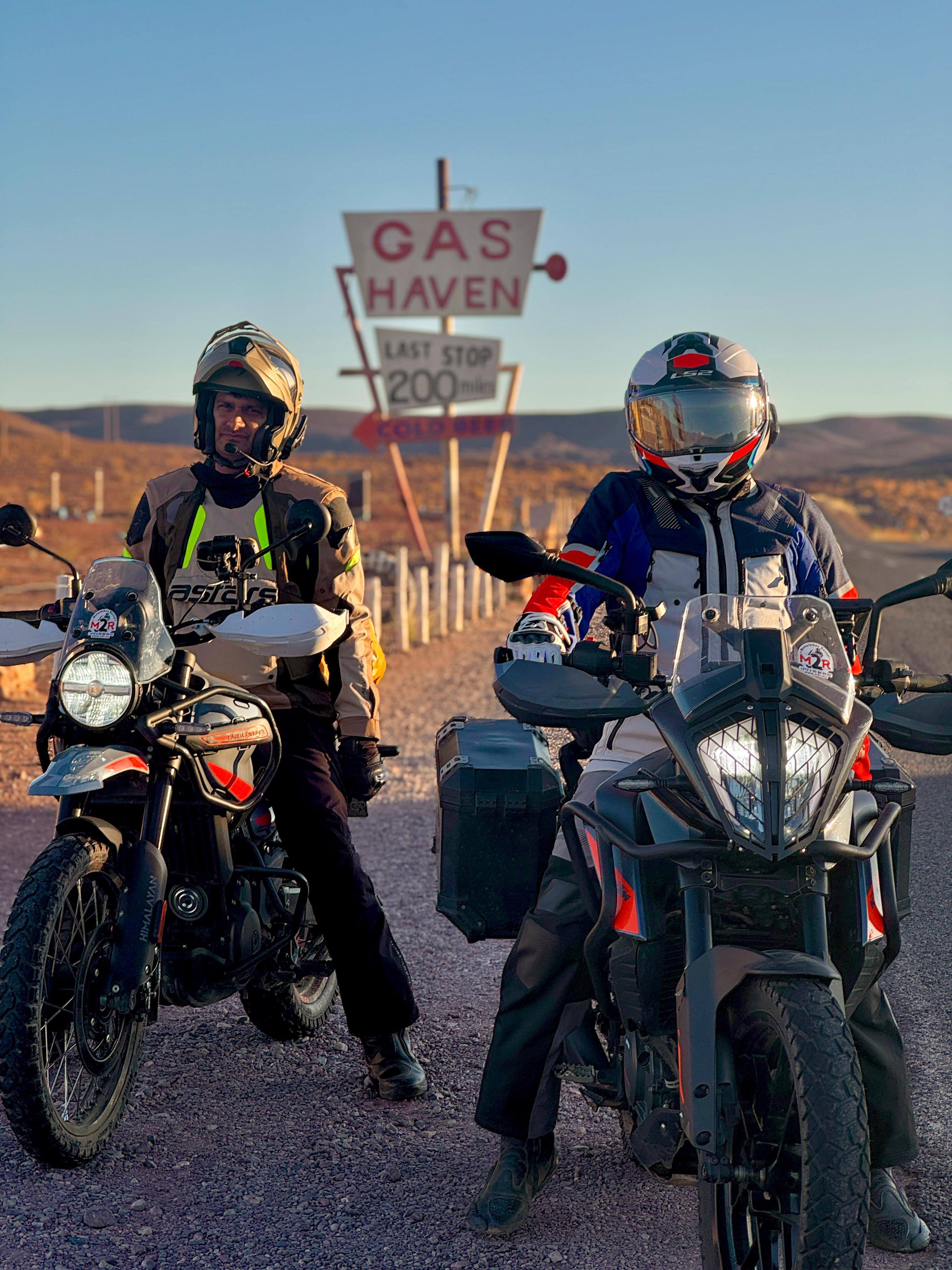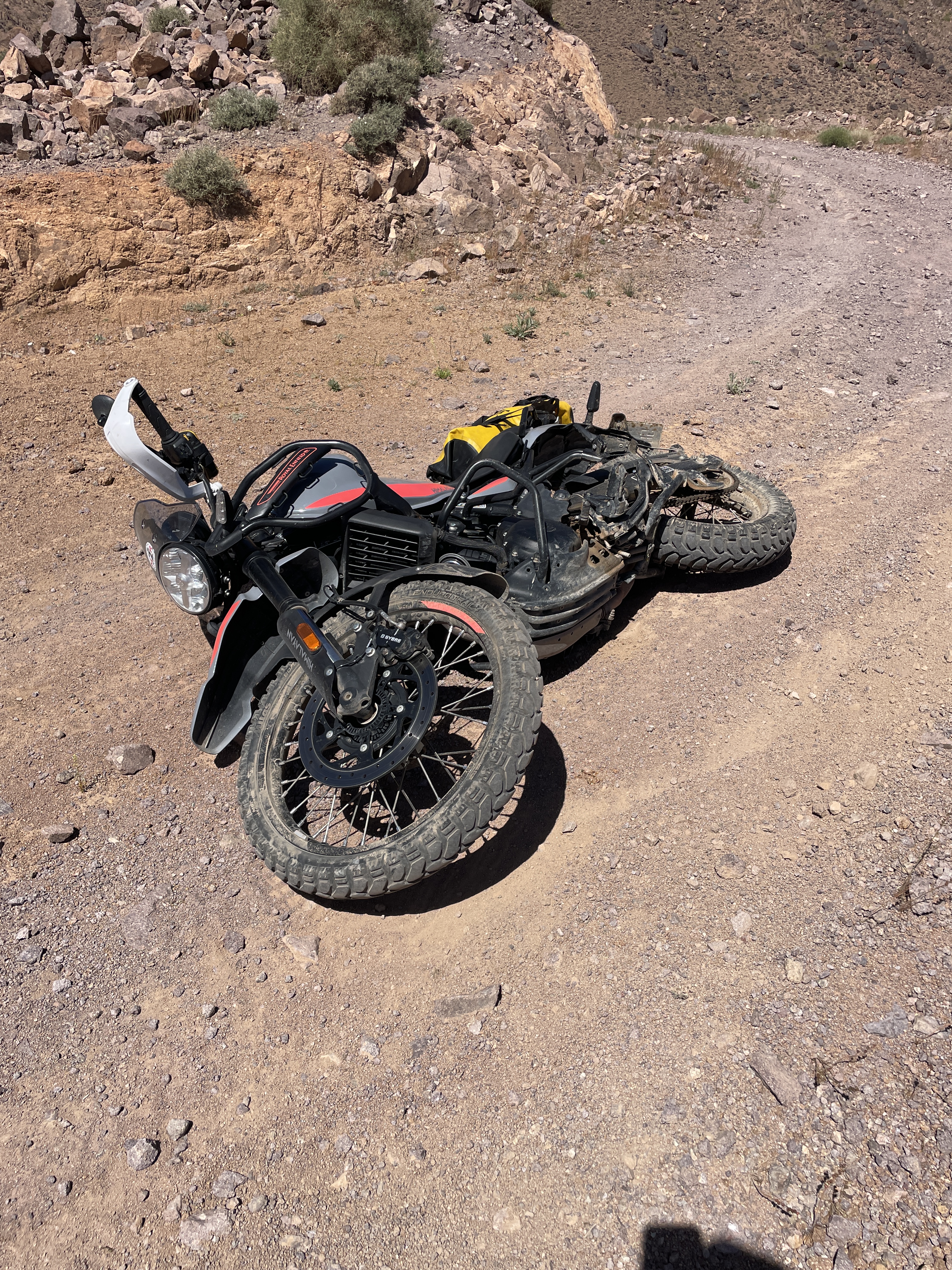 The bikes had no gas in them—zero—so we rode to the nearest gas station to fuel up. We were finally on our way, but at the next roundabout, I lowsided the Enfield. I must have given it too much gas on the greasy new rear tire, and the bike slid out from under me. Thankfully, I managed to jump off the bike. My knee scraped the ground, but my gear did its job. The bike’s crash guards prevented any serious damage, so we continued on our way. It was definitely a rookie mistake—too much throttle while leaned over on brand-new tires. Anyway, not much harm done, but I rode the rest of the day a lot more carefully.