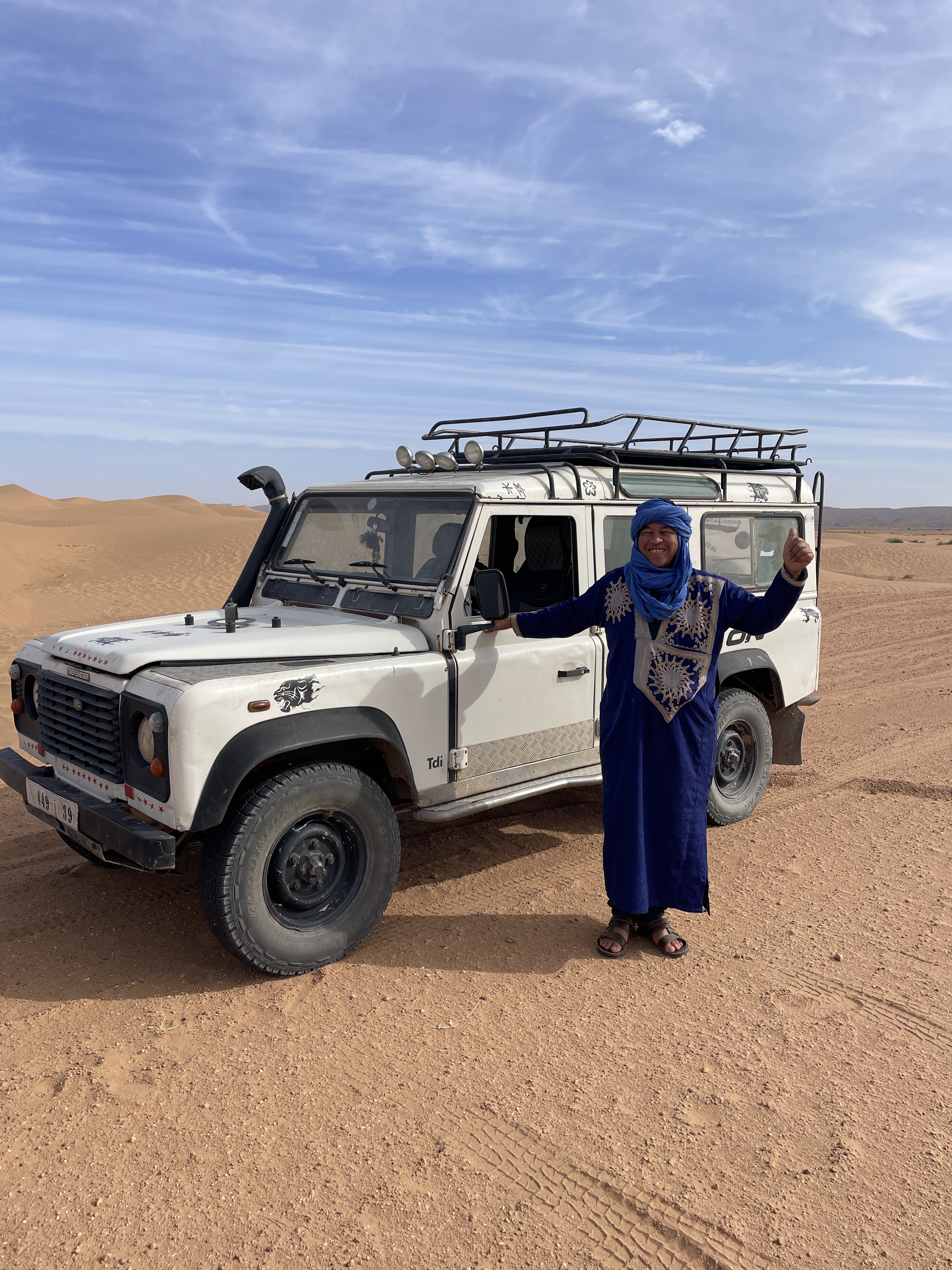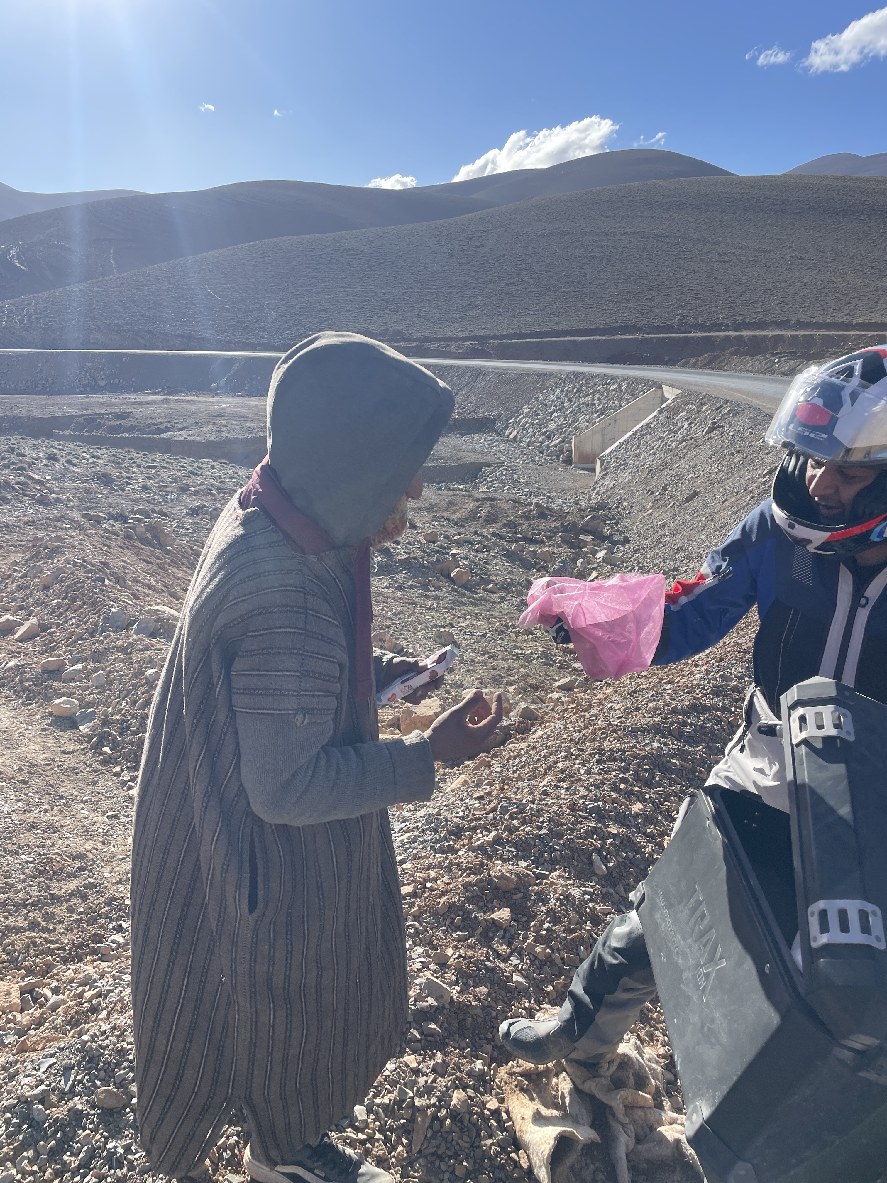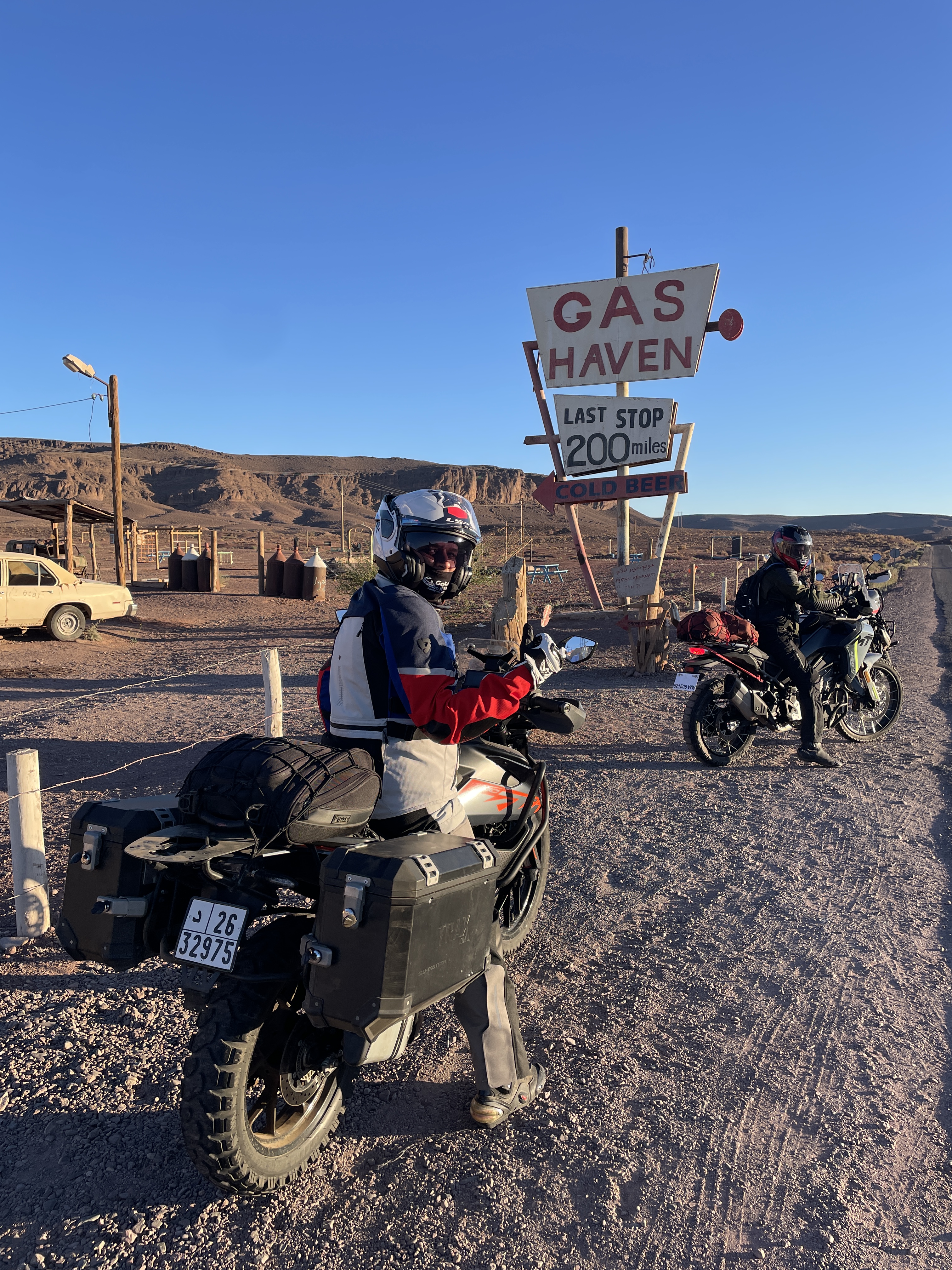 Once we hit the highway, it was a long, straight stretch all the way to the Sahara. We passed through Zagora, where we stopped to refuel and grab some ice cream. The fuel station was literally a “cart” with two medium-sized tanks of gas. Right around there my stomach started acting up. I really needed to use a restroom, but there weren’t any around. Eventually, a gas station shopkeeper let me use a traditional clay toilet at the back of his store. It was small, I had to duck to get in, and there was no flush, just a plastic bucket to pour water down manually. It reminded me of the kind of toilets you find in rural parts of India, like the ones we used when visiting a rural temple in Maharashtra.