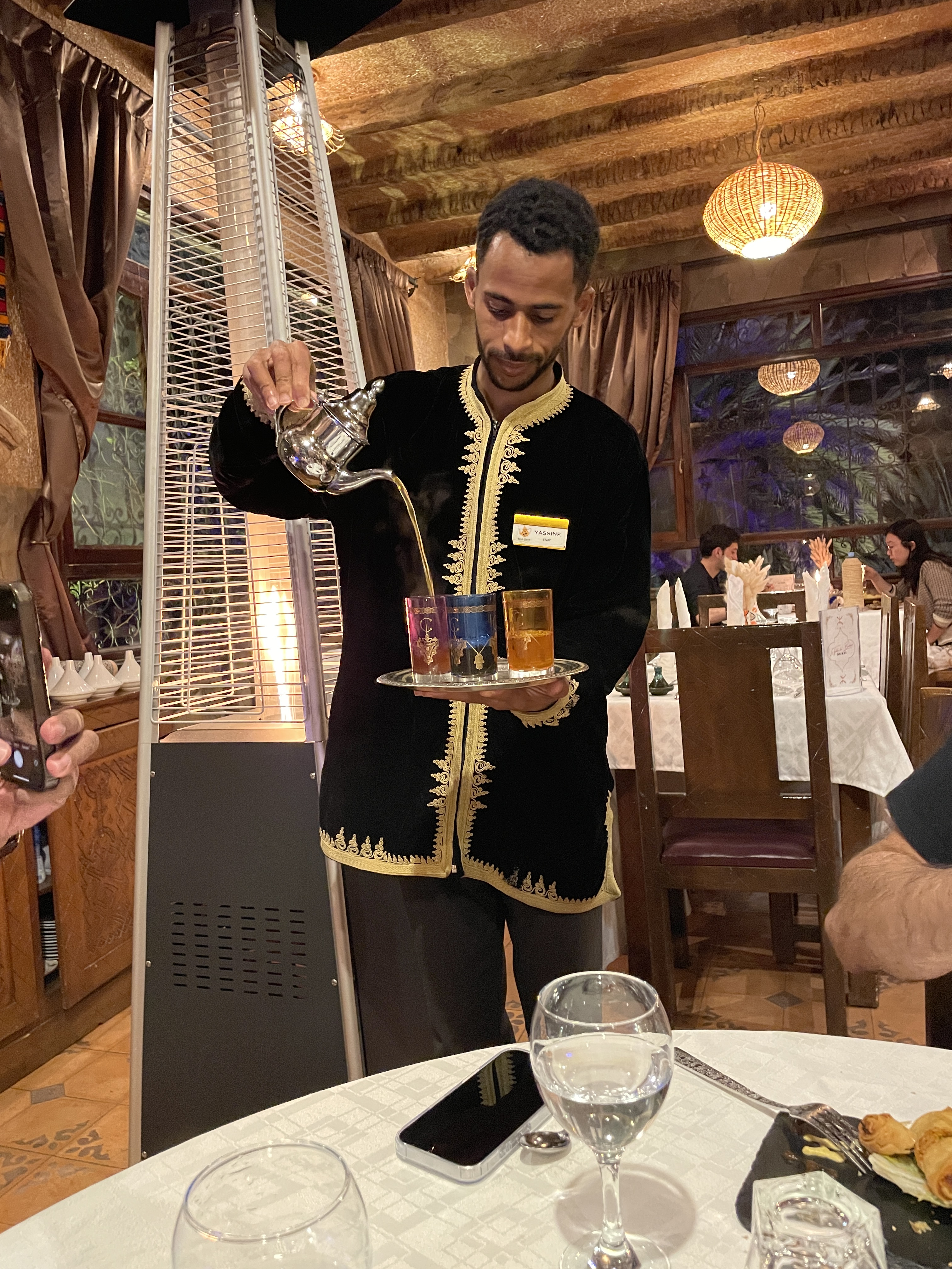We had lunch in Ouarzazate, at the top-rated restaurant on Tripadvisor, “The Full Sun.” The food was good, very Westernized, but expensive by Moroccan standards.