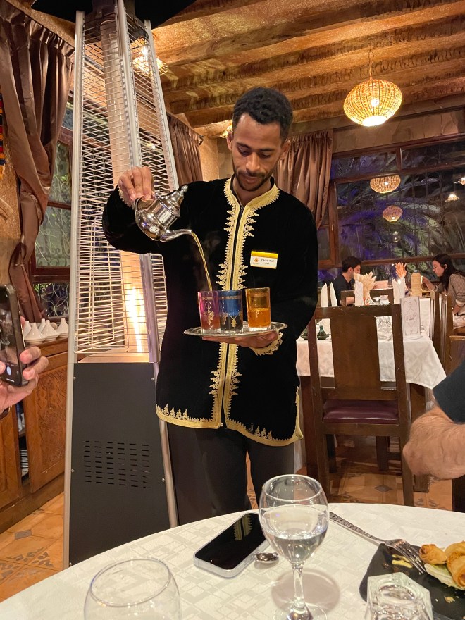 For dinner, Goku found what might be the fanciest restaurant in all of Marrakech: Comptoir Darna. It’s outside the Medina and felt like a completely different world. The crowd was young, stylish, and modern… men in suits, women in dresses, the full party vibe. The drinks and dinner were excellent, and there was live entertainment too. A few belly dancers came around, and one of them even pulled me in to dance with her. We gave them generous tips.