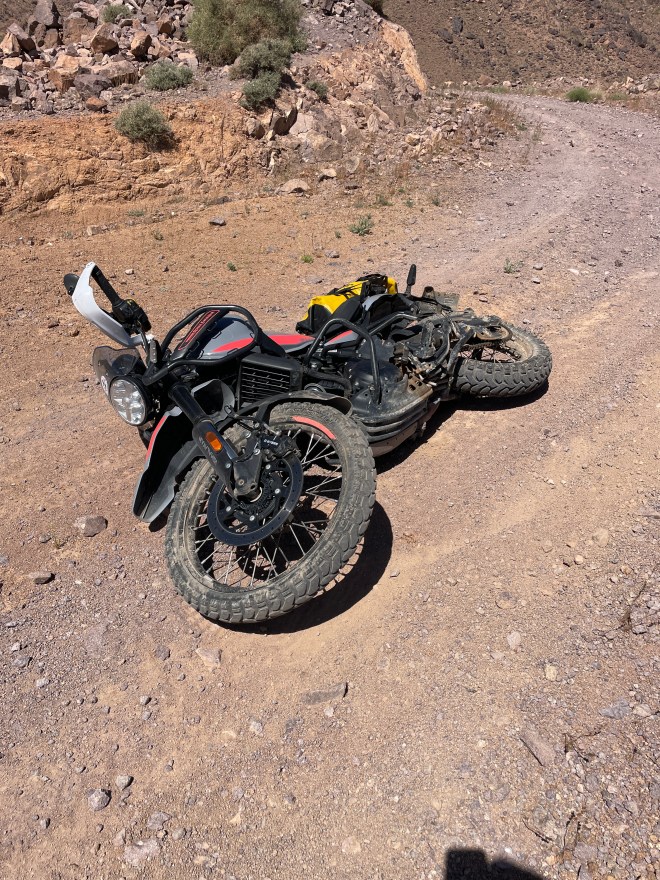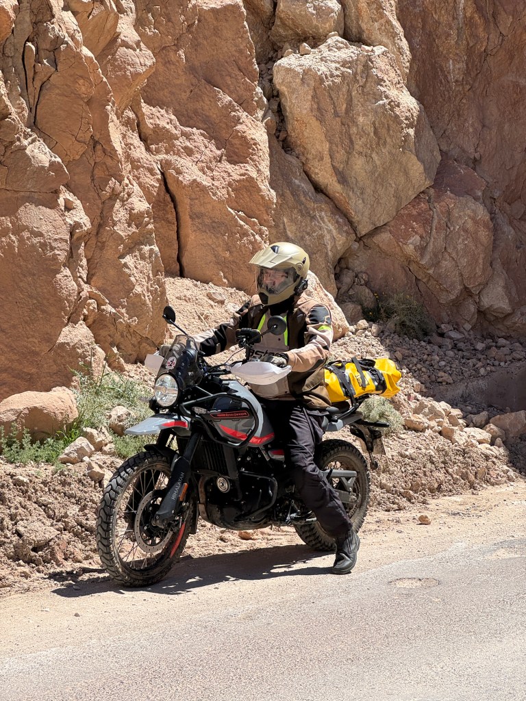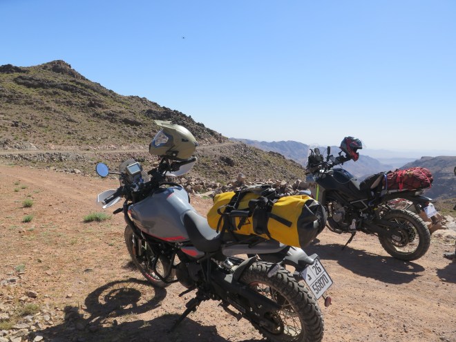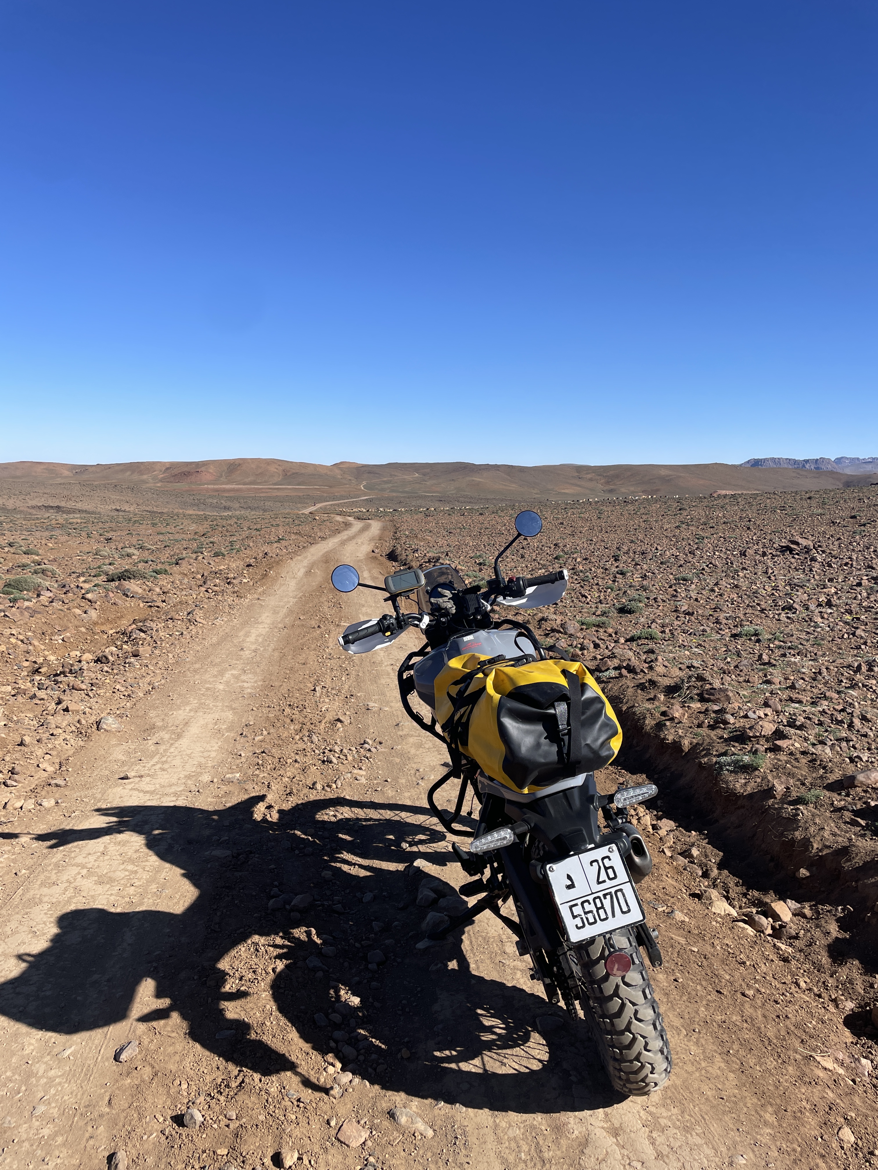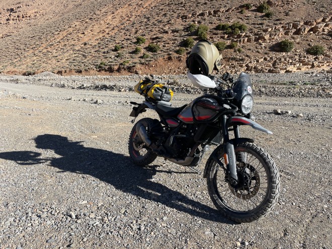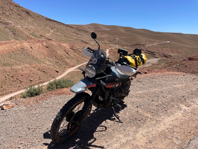 We rode through the same twisty roads in the Atlas Mountains again. The Enfield did very well on the tarmac, given that it is mainly a street-oriented, heavy standard. At one point, a truck was trying to overtake another one, both of them going uphill. So both lanes of the two-lane highway were blocked, and Goku and I had to squeeze through on the narrow shoulder. Terrible road manners. I flipped the guy off.
