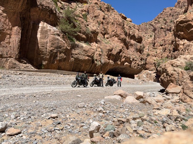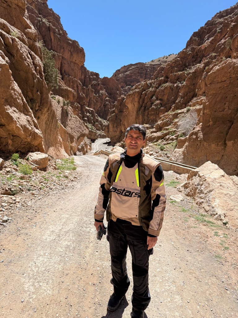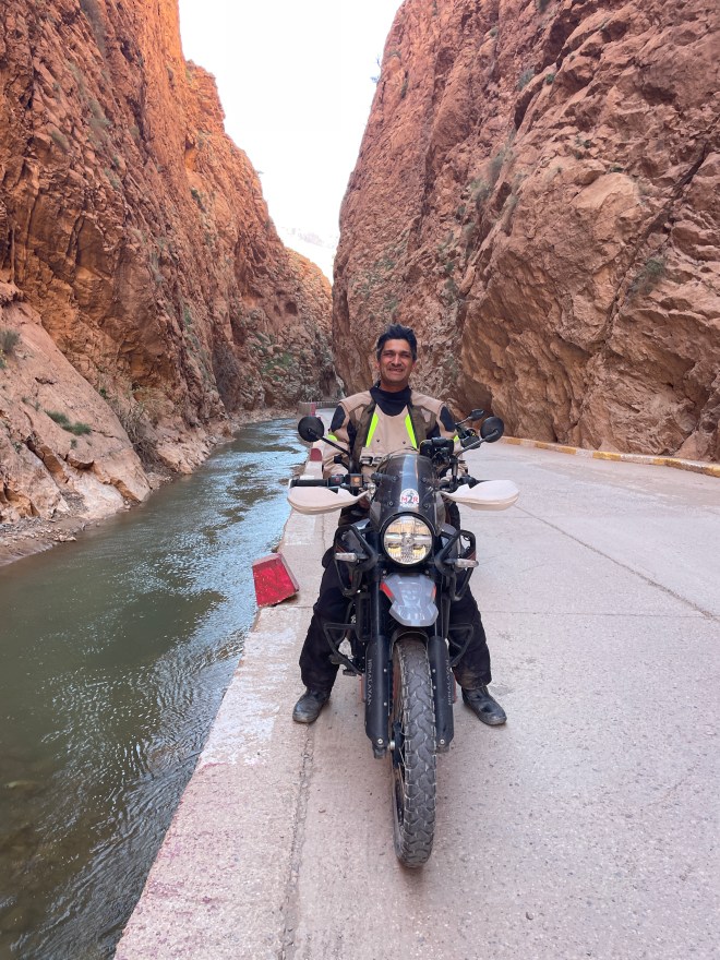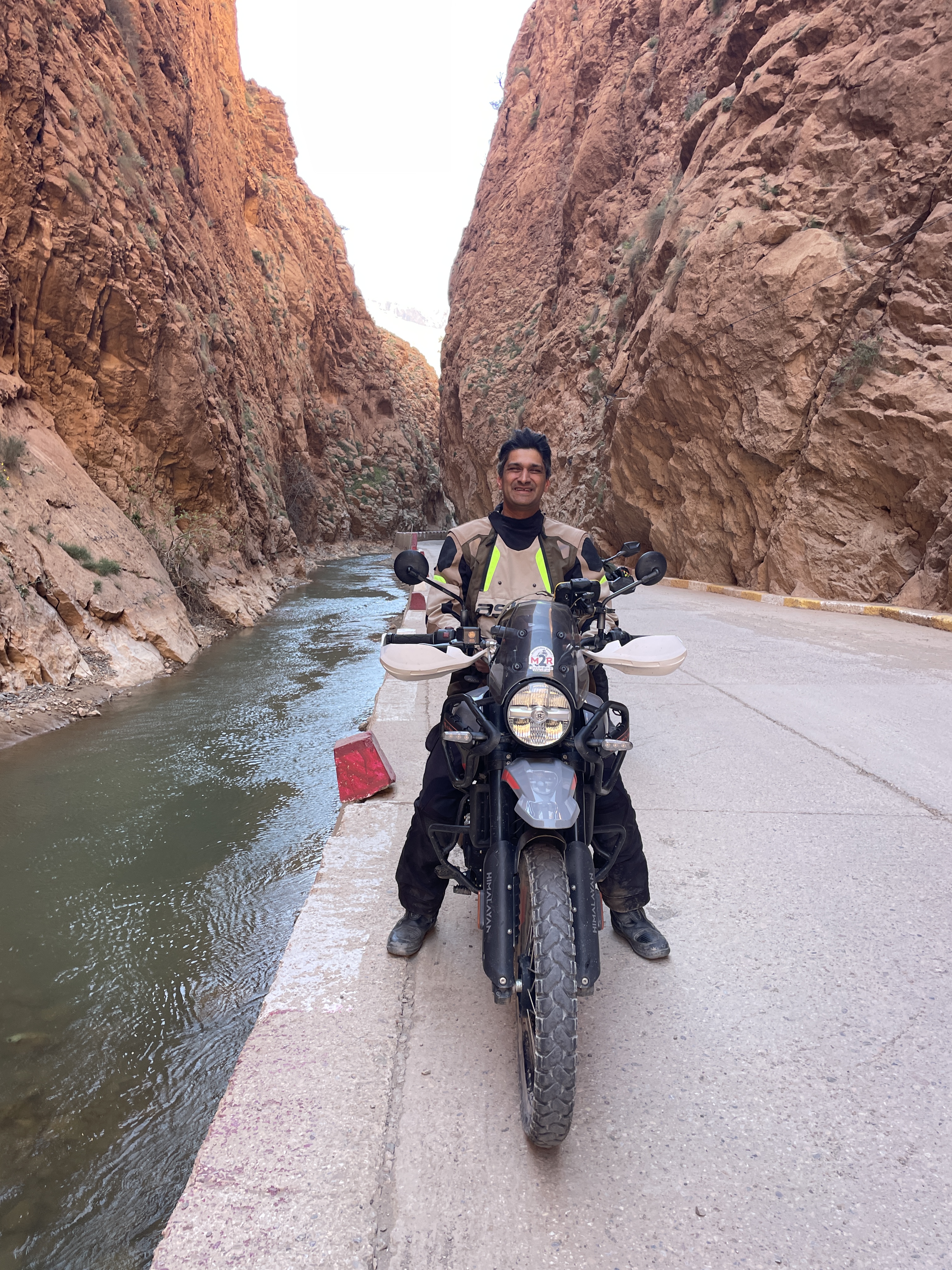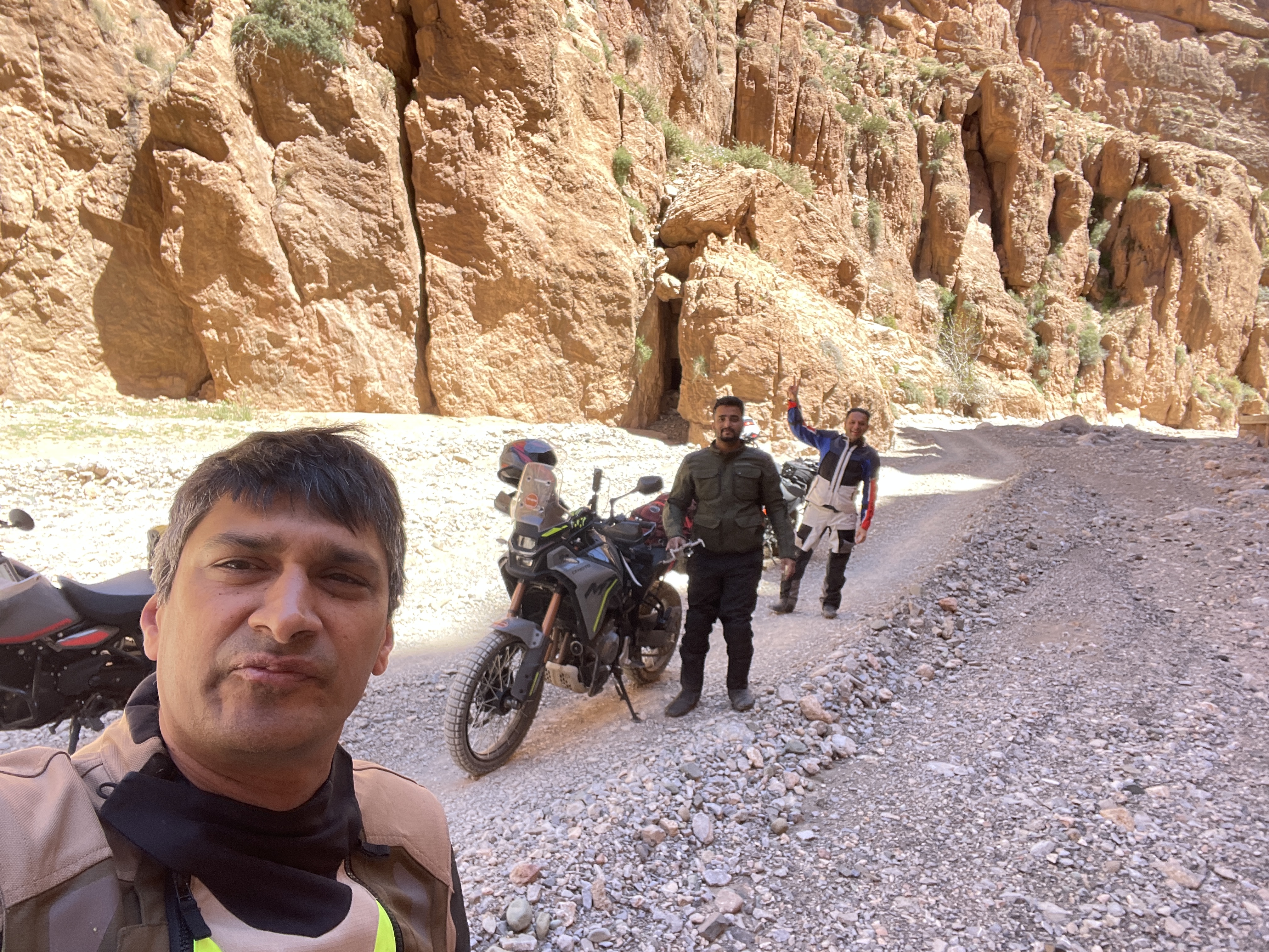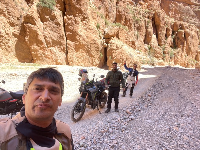 On Day 2 we visited three of the most famous gorges in Morocco. First up was the Gorges d’amejgag. We took the highway N10 out of Ouarzazate to the town of Kalaat M’Gouna. This was a long, straight road with very little traffic. It got a bit boring to hold the bike steady at 120kmph, but we made it without any incident. The track changed to dirt after a few km and we crossed a dry river bed as we approached the gorge. The gorge itself was beautiful, with the morning sun hitting it at an angle and brightening the sky. We stopped for pictures and Gokul took out his drone again. He got a few good videos as we rode deeper into the gorge. As we were stopped, we came across a group of British dual-sport riders who had trucked in their bikes from Manchester. This was a common theme—we met many groups of bikers from around the world on this trip.