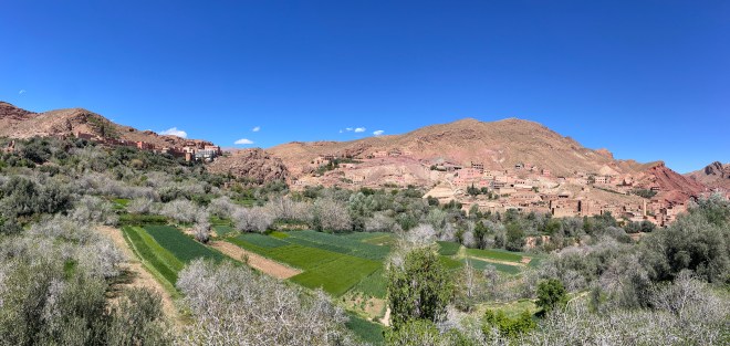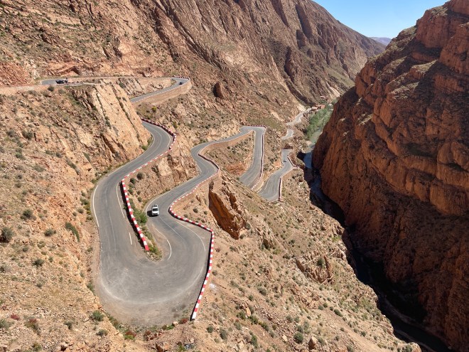 We then took the road up into Dadès Gorges. This is a pretty commercial area, with lots of shops, restaurants, and hotels nearby. The twisty climb up to the iconic viewpoint is nice. And the view from the restaurant up top (Hotel Timzzillite) is phenomenal. We stopped there and took a bunch of pictures. As we were leaving, a bunch of overlanders arrived there in their “rigs.” Maybe a dozen or so Land Rover Defenders, Land Cruisers, and maybe a Ford truck. We chatted with them; they were from England and the guy mentioned his Land Cruiser has traveled over half a million kilometers all over Europe and Africa, without any problems. This reminded me of the typical saying: Toyota owners boast about how many miles they have traveled, while Ferrari owners boast about how few miles they have driven.