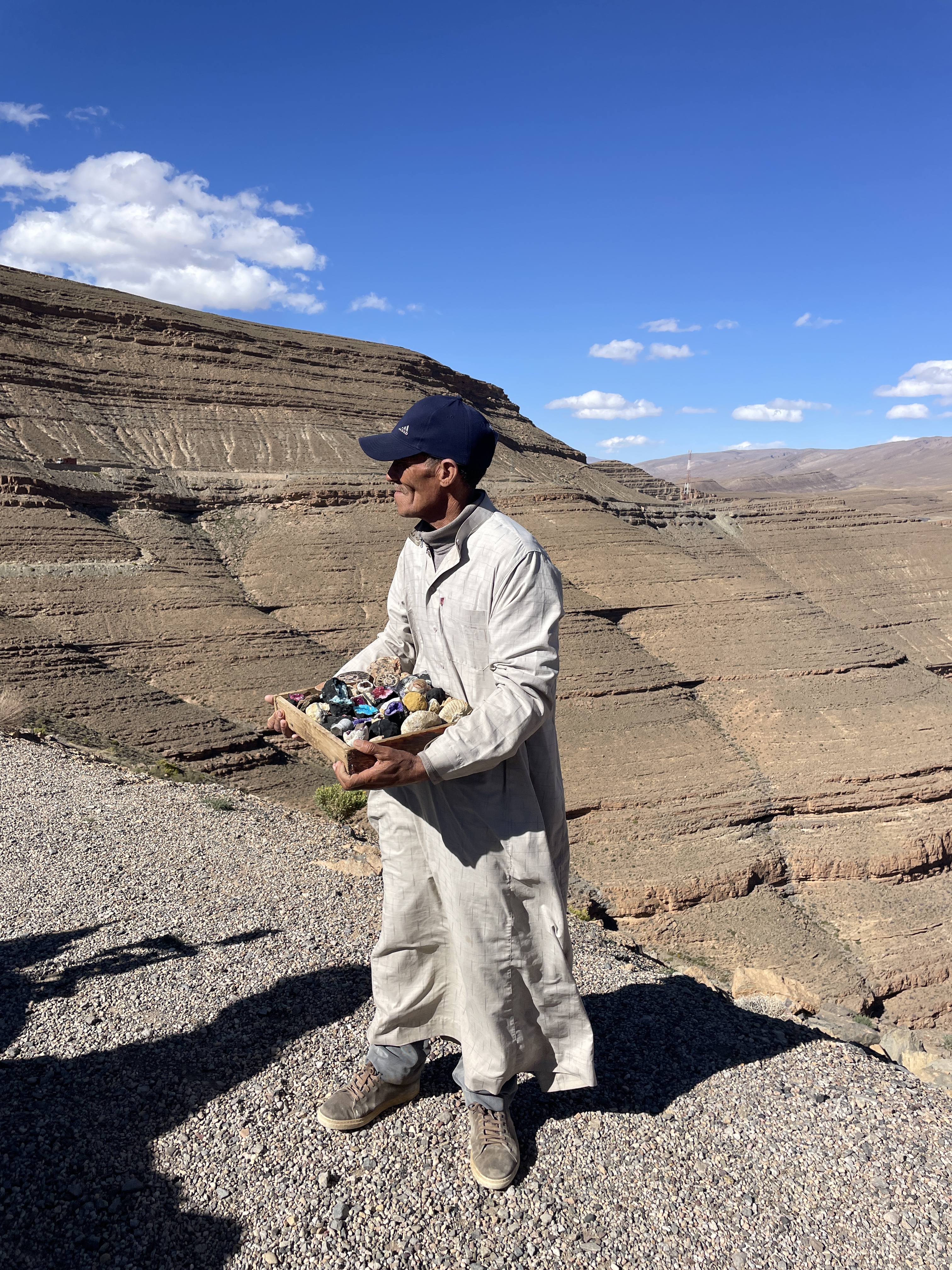 The rest of Dadès was frankly, boring. The scenic part is very short and we took a few pics. The riding is mostly through a commercial area, until you get a bit far out, and that’s when the roads open up. As we climbed up the mountain switchbacks, we came across a few European cyclists who were riding in the area. It is not uncommon to see a roadside vendor holding a tray selling some small knick-knacks on a random switchback in Dadès.