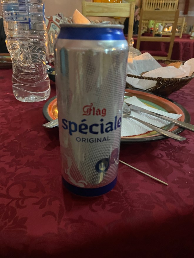 This was a basic place to stay, but the hosts were very warm and friendly. We chatted with the owner of the hotel over dinner. He was a nomadic Berber by descent and had traveled to most countries in Europe and Northern Africa. A dram of single malt was all it took; he was soon laughing along with the rest of us. We discussed Moroccan history and culture, the Berber way of life, and he kept coming back through the night for more pegs of whisky. The hotel was his family business, originally started by his father. His son was at the University in Lyon, France, while his nephew’s wife was the cook at the restaurant. Alcohol is not easily available in Morocco, so we asked the nephew to go to the town of Tinghir and bring us some beer. We had some local Moroccan beer—Flag Spéciale Originale—which was nice and relaxing after a day of riding.