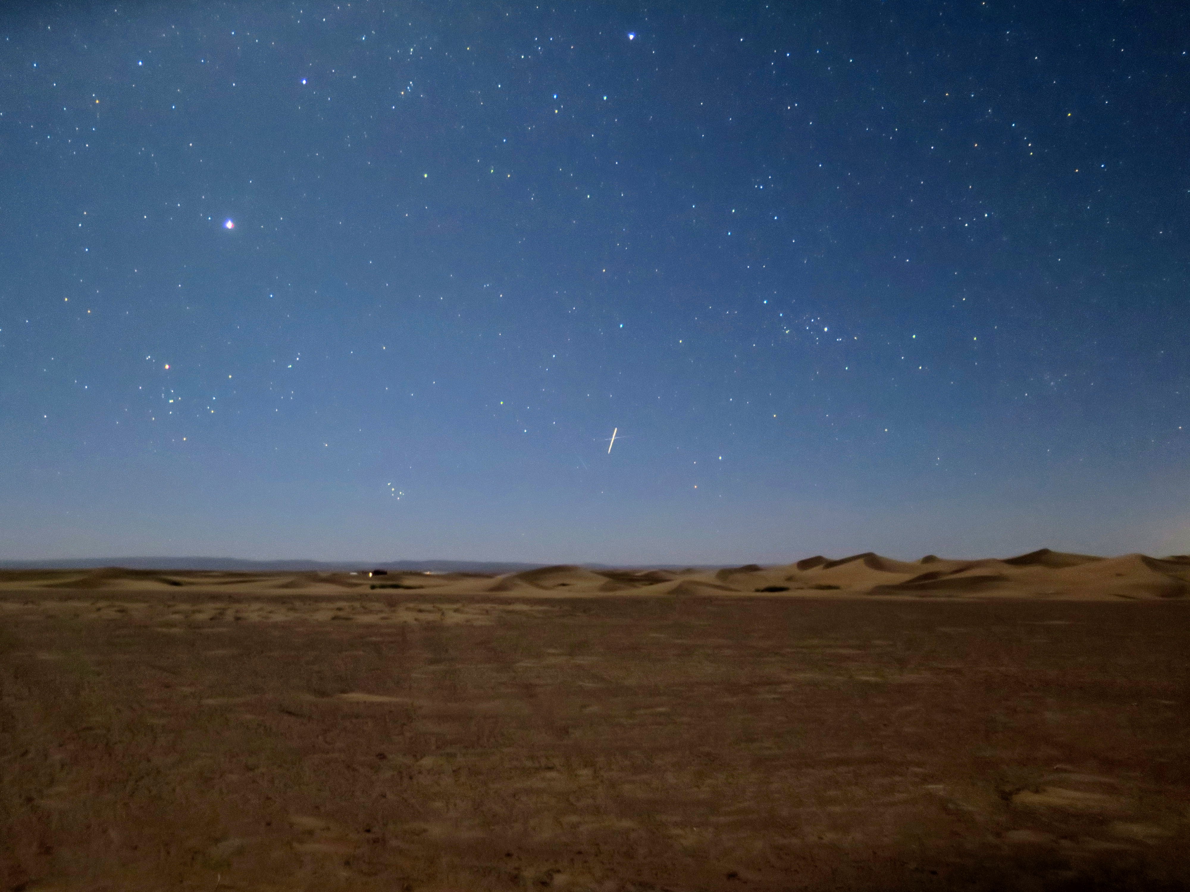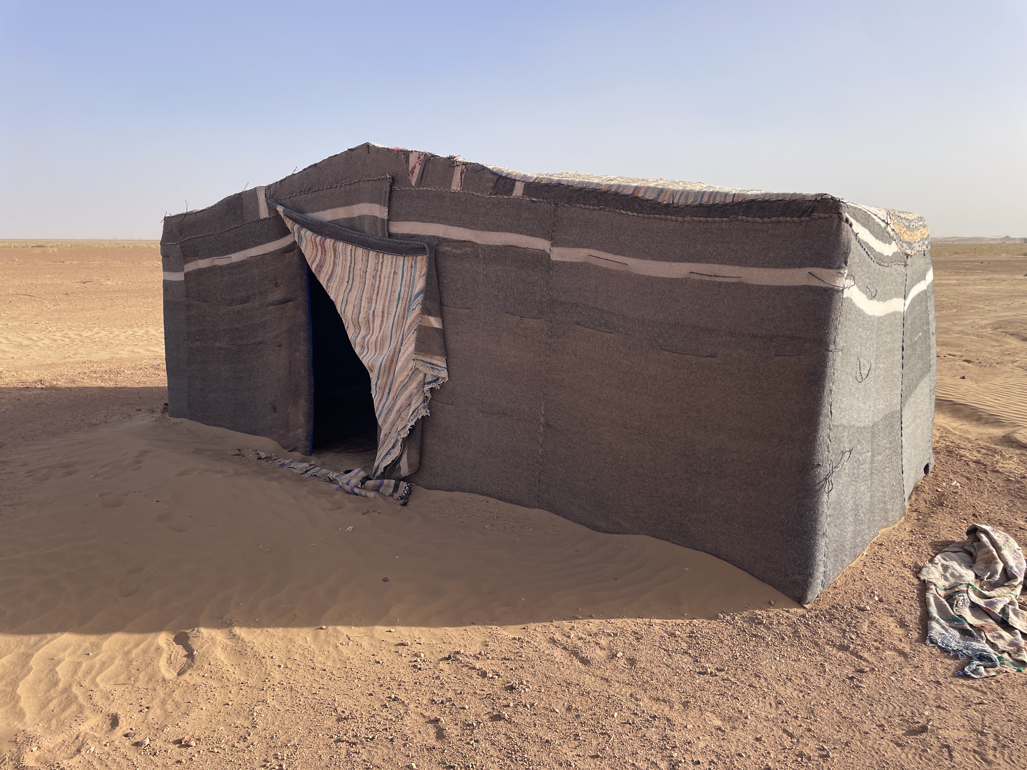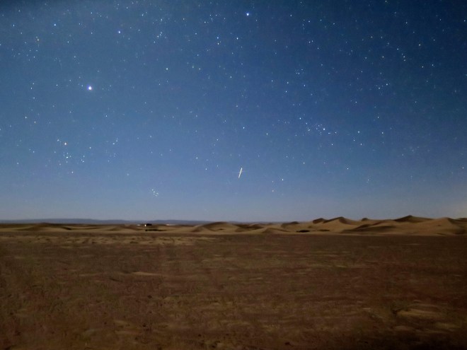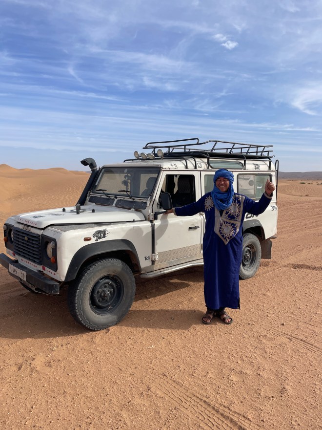 Zagora is known as the gateway to the Sahara, and from there we started seeing more and more sand dunes. We eventually reached the town of Tagounite, where we met the driver from our desert camp. From there, it was a short 20-minute ride over a dirt road to the camp (“Mhamid Sahara Camp, Le Chant Du Sable”). The sand got tricky in a few places, but we made it without much trouble.