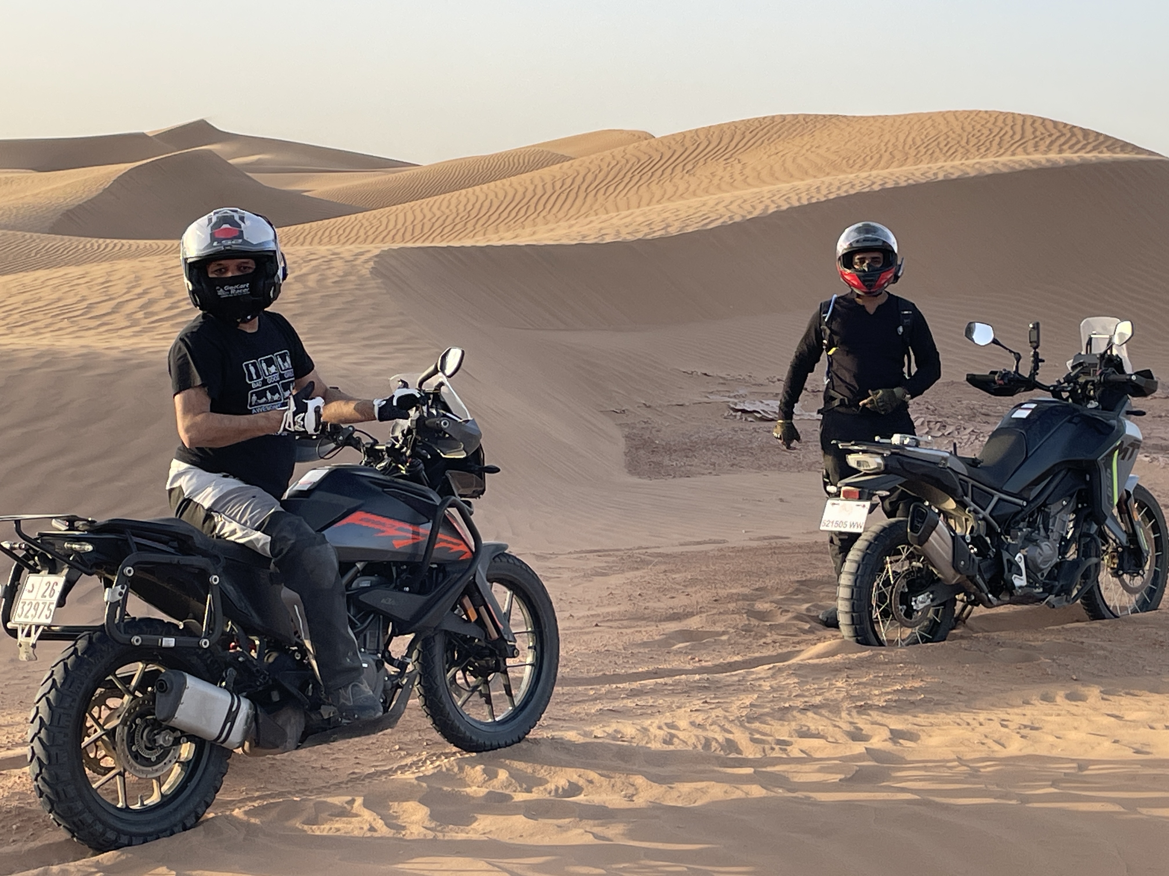 As soon as we got settled, we took the bikes out to ride on the dunes. Shobhit went first and did well, managing to cross a few dunes with ease. I followed, but it was tough… I got stuck a couple of times but eventually made it through. Gokul’s bike didn’t fare as well. It kept stalling on the climbs, probably a mix of low torque, bad tires, and traction control issues. I tried his bike too and found it nearly impossible to get it over the dunes.