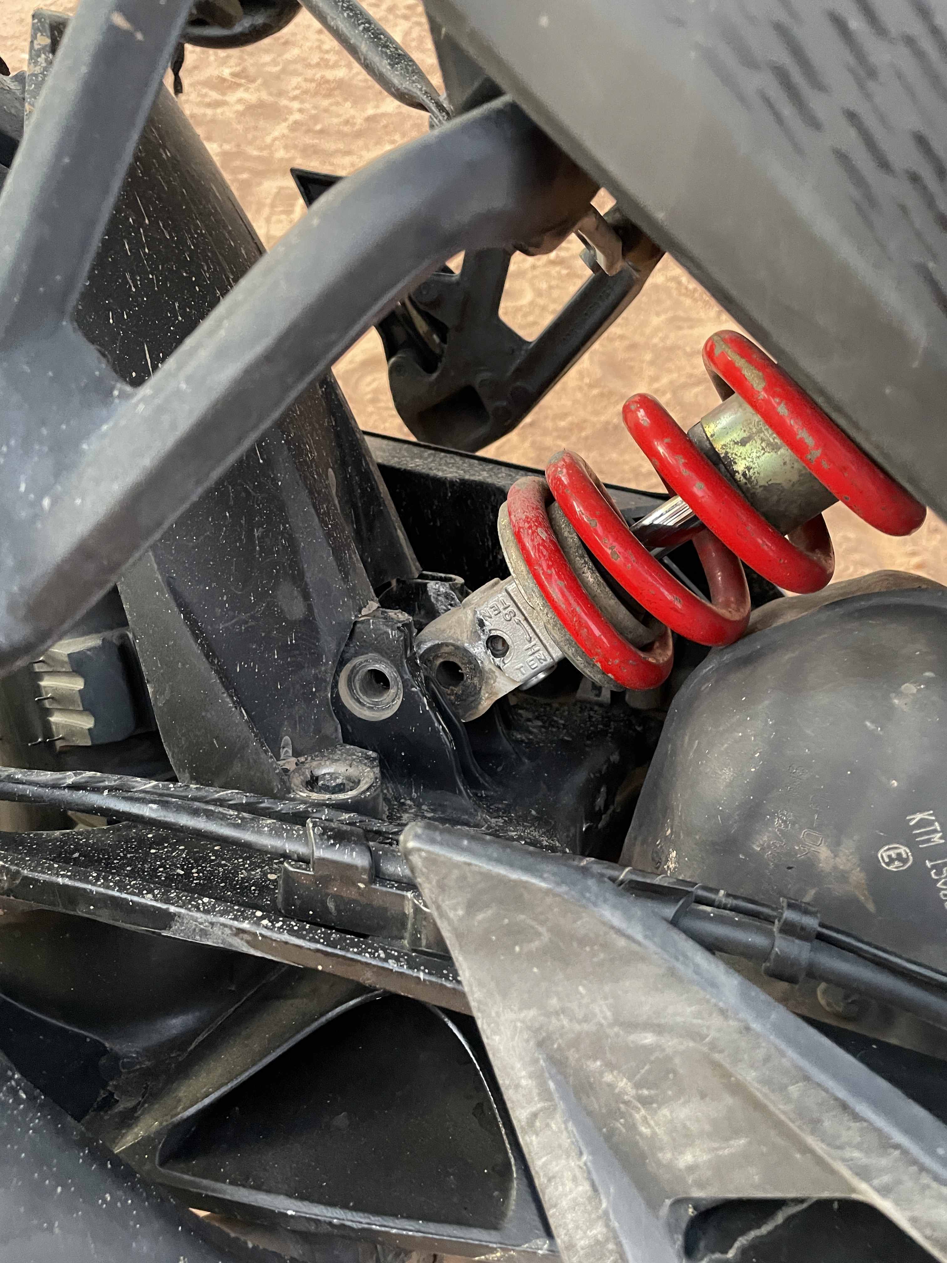 At one point, while helping Shobhit get unstuck from some deep sand, I lifted the rear of his bike. As I set it back down, we heard a strange clank. On closer inspection, we realized the KTM had lost the bolt that connects the rear shock to the swingarm. The shock was just floating loose and knocking against the curved part of the swingarm under the fender. It was a bit of a shock (pun intended). Shobhit stopped riding after that. He later looked through some photos and figured the bolt had probably come loose earlier in the day, maybe even while we were still in the mountains. He’d essentially ridden all those high-speed roads with a dangling rear shock. Thankfully, nothing worse came of it, and we planned to fix it the next day.