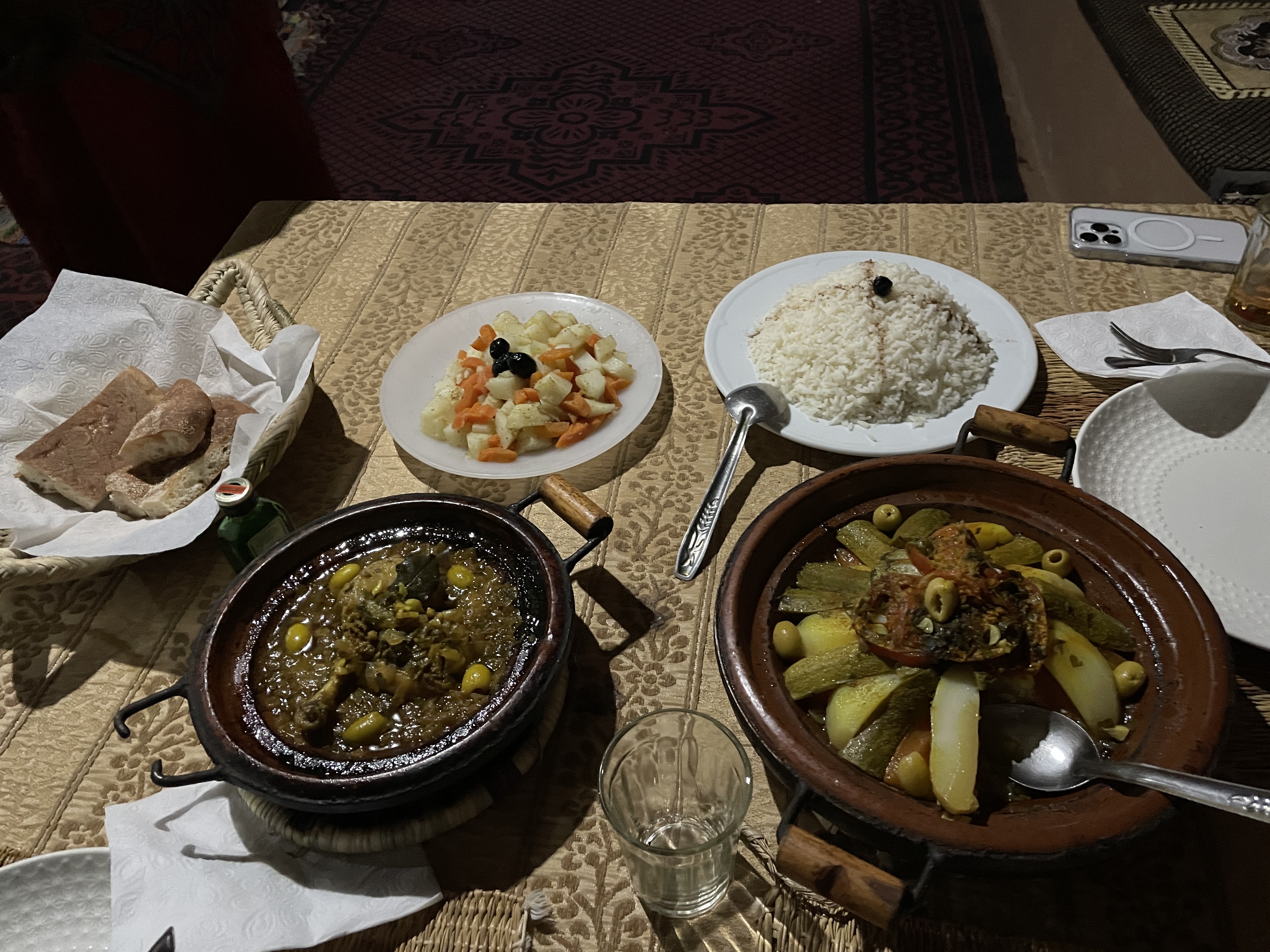 Dinner at the camp that night was fantastic. Another classic Berber meal, but this time with a flavorful soup and rice alongside the tagine. After dinner, we moved to the outdoor deck, where the staff brought out drums and began singing traditional Berber songs. We joined in with some Bollywood numbers too.