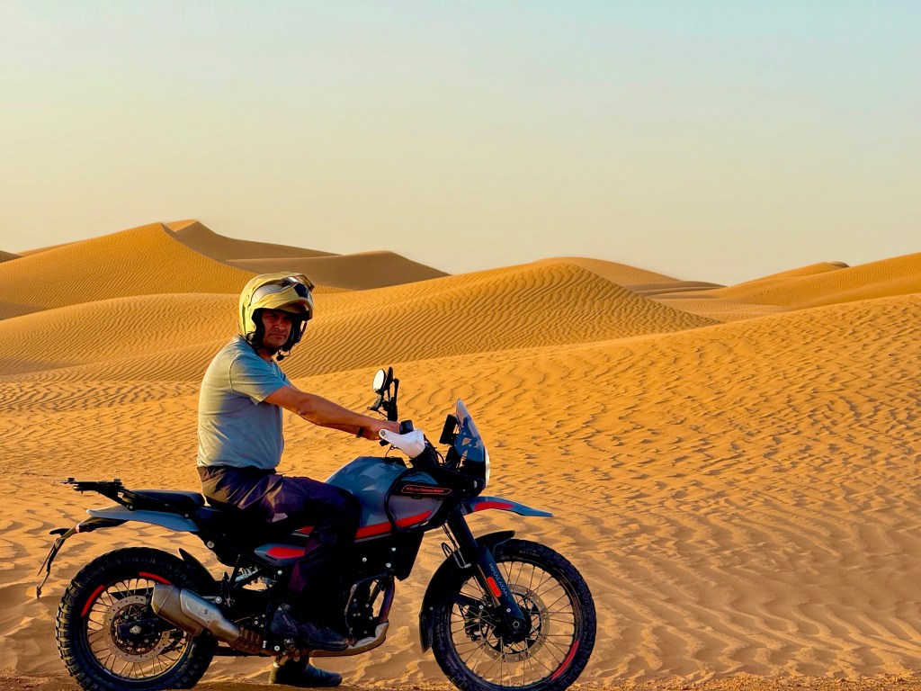 Despite the mechanical scare, we had a great time riding around, taking pictures, and just soaking in the surreal landscape. Shobhit and Gokul also tried sand boarding. As the sun began to set, everything turned golden. There was a peaceful stillness in the air. I found a spot on one of the dunes and sat for a while, a nice quiet moment of reflection and calm. I can still remember that moment; I’m writing this almost three months later.