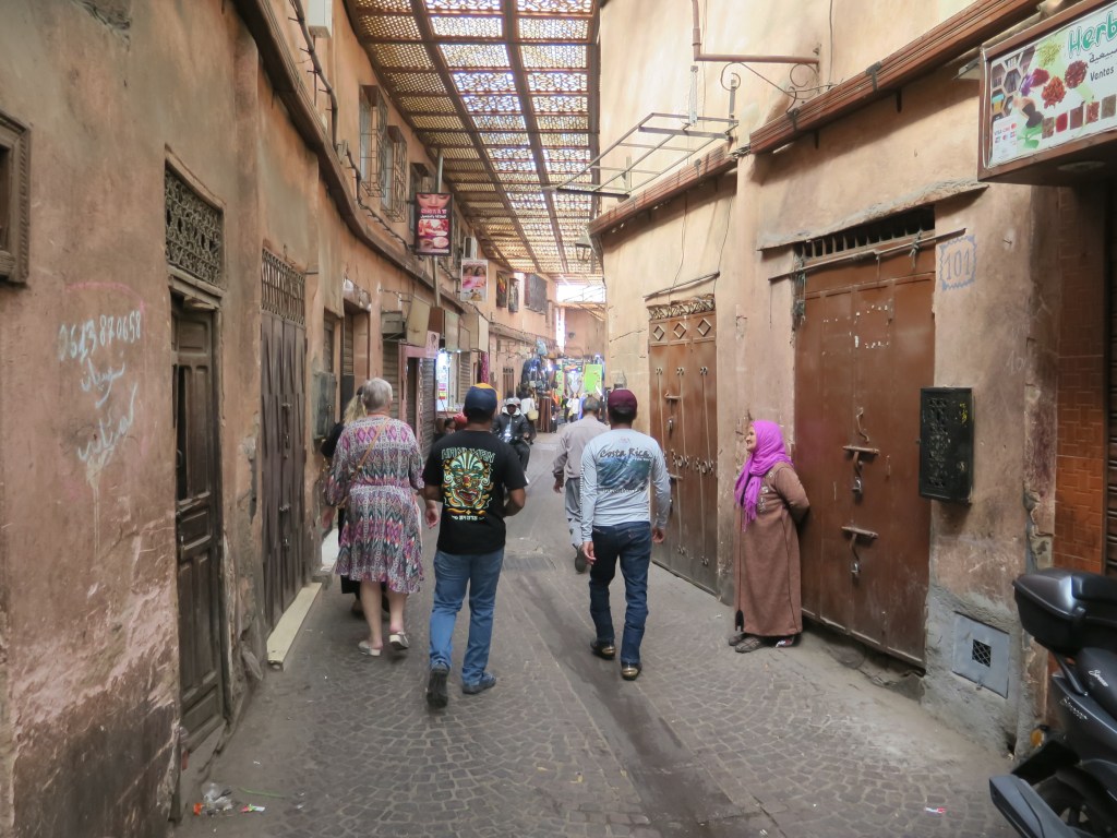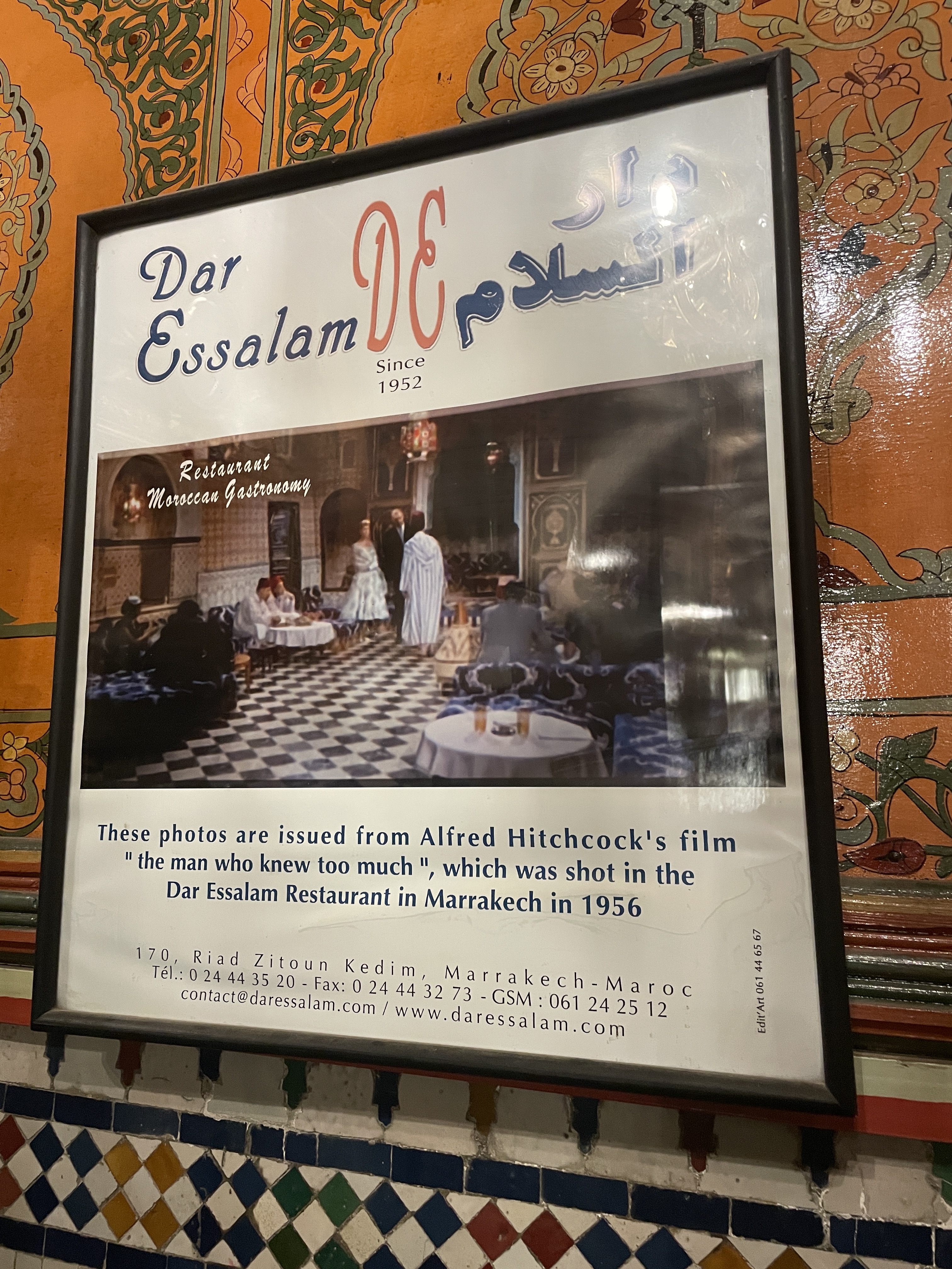 A couple of hours later, we landed in Marrakesh, where our hotel sent a Land Cruiser Prado taxi to pick us up and get us into town. Our hotel for the first night was called Riad Africa, which is a short walk from the main entrance to the Medina. It was a nice, cozy little place with about seven or eight rooms. After we checked in, we wandered around the Medina for a little bit, looking for a place for dinner. We had dinner at a restaurant called Dar-E-Salam, a fancy and ornately decorated place which was used as a shooting location for the Alfred Hitchcock film “The Man Who Knew Too Much” (1956). Dinner was a traditional Moroccan tagine, the first of many that we would eat on this trip.