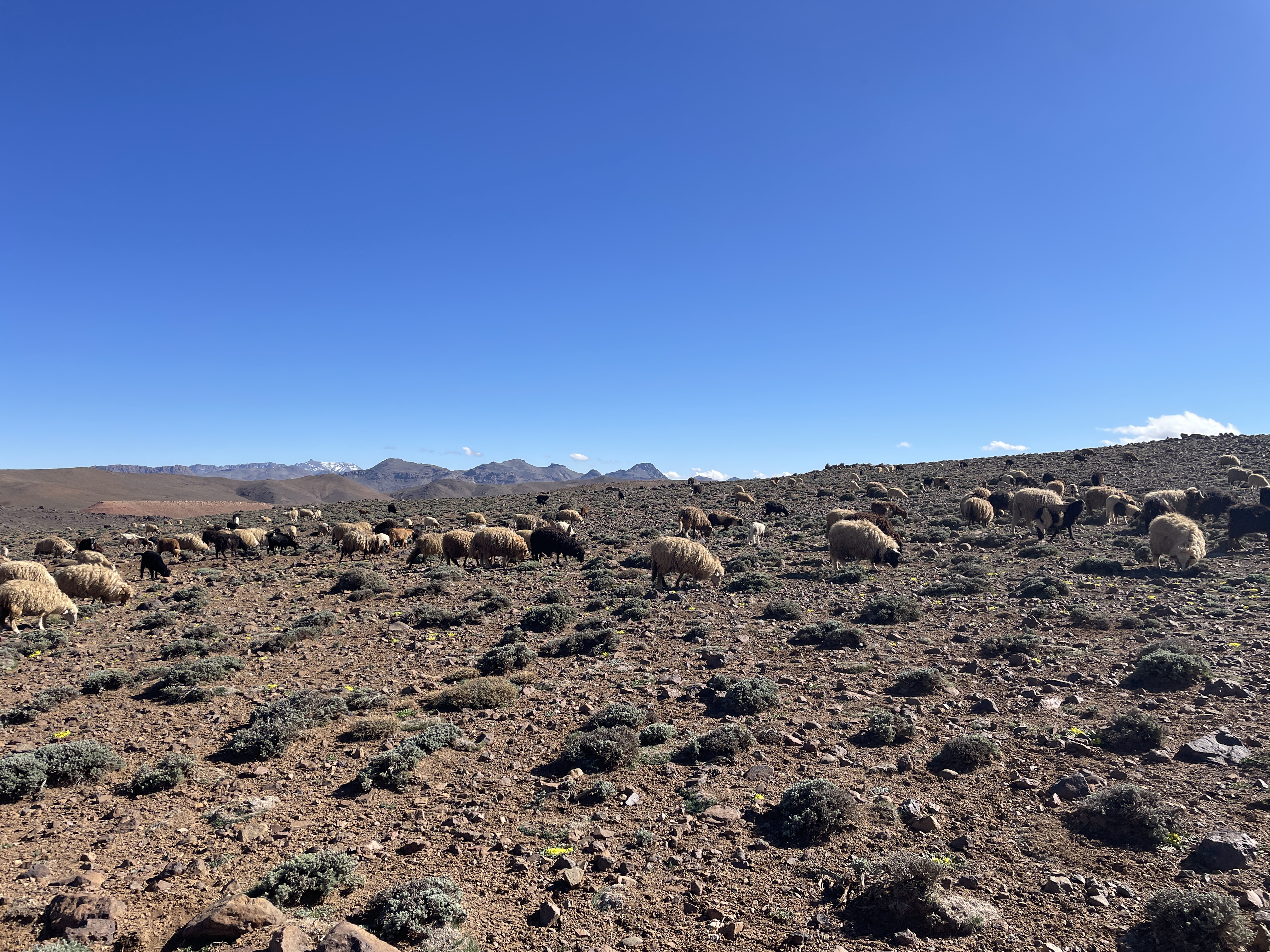 From there, we started along the off-road route mentioned in Chris’ book (Sections J6 and J4) from Agouim through the “three-mast pass” towards Amassine and eventually Anezal. Initially it started off as a wide two-track dirt track comfortable for big bikes, but as we went deeper into the countryside, the road narrowed down to a nice single track, used regularly by local travelers on their motorcycles. We stopped at the famous heart-shaped watering trough and Gokul pulled out his drone. He captured some great video, even though the winds were gusting quite severely. We saw a few nomadic shepherds along the way. There was no traffic there at all, maybe one to two local bikers (on 100cc air-cooled bikes with normal tires) passed us on this 100+ km stretch. It was amazingly peaceful to ride through the desolate wilderness of Morocco, and the weather was perfect—clear skies and not very hot, not too cold.